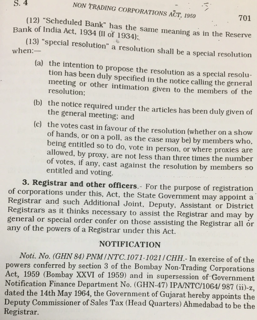 The Said Act was incorporated on 30th April 1959 which was adapted and modified by the Gujarat Adaptation of Laws Order,1960. This Said Act was brought in force to provide for incorporating regulations and winding up of non-trading corporations whose objects are confined to the State of Bombay and for the matters incidental thereto. Thus many associations and body of individuals which wished to form a corporation whose objective were non profit were registered under the Said Act. For the purpose of registration of corporations under this Act, the State Government was suppose to appoint Registrar and such Additional Joint as it thinks necessary to assist the Registrar and may by general or special order confer on those assisting the Registrar all or any powers of Registrar as bestowed in the Said Act. Therefore a Government Notification was issued by Finance Department dated 14th May 1964 , by that the Government of Gujarat appointed the Deputy Commissioner of Sales Tax (Head Quarters) Ahmedabad to be the Registrar.