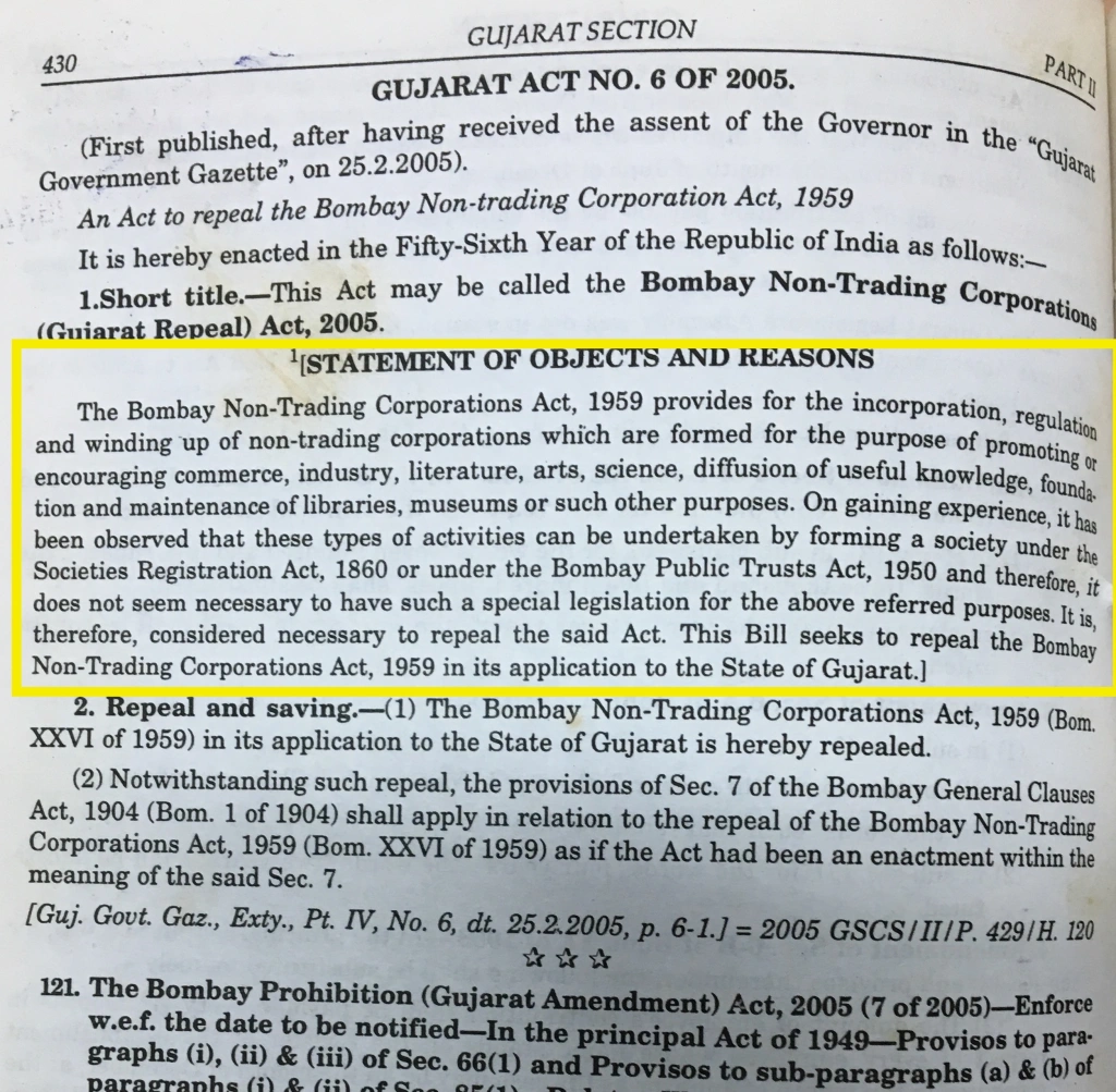 On 25th February, 2005 the Government of Gujarat brought into force an act to repeal the Said Act by introducing Bombay Non-Trading Corporations (Gujarat Repeal) Act, 2005 (hereinafter referred to as “Said Repeal Act”), therefore the repeal was made under provisions of Section 7 of the Bombay General Clause Act, 1904. The Said Repeal Act was introduced with an objective and with an observations that the type of activities as envisaged under the Said Act can be also be undertaken by forming a society under the Societies Registration Act, 1860 or under the Bombay Public Trusts Act,1950 and therefore it was seemed unnecessary by legislatures to continue a special legislation for the purpose of promoting or encouraging commerce, industry, literature, arts, science, diffusion of useful knowledge foundation and maintenance. Thus it was expected by the associations and corporations incorporated under the Said Act to re-register or form a new association by dissolving the existing association registered under the Said Act, however it is important to note that since the Said Repeal Act was made in such a manner that the provisions of Section 7 of Bombay General Clause Act, 1904 was applicable as if the Said Repeal Act has been an enactment within the meaning of the said section 7 of Bombay General Clause Act. Therefore Section 7 of Bombay General Clause Act, 1904 is reproduced herein under